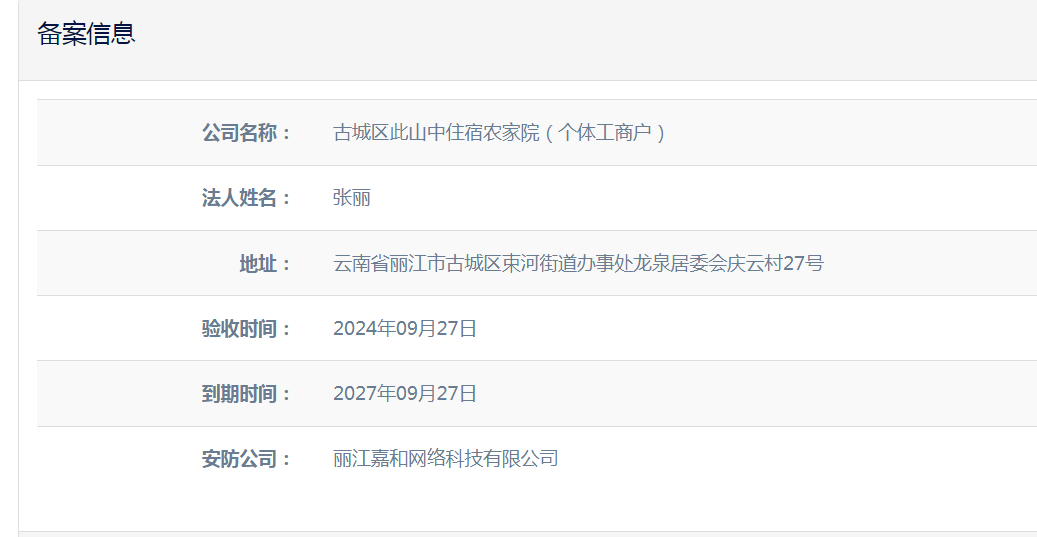 古城區此山中住宿農家院(個體工商戶)電子監控安防合格證下證通知