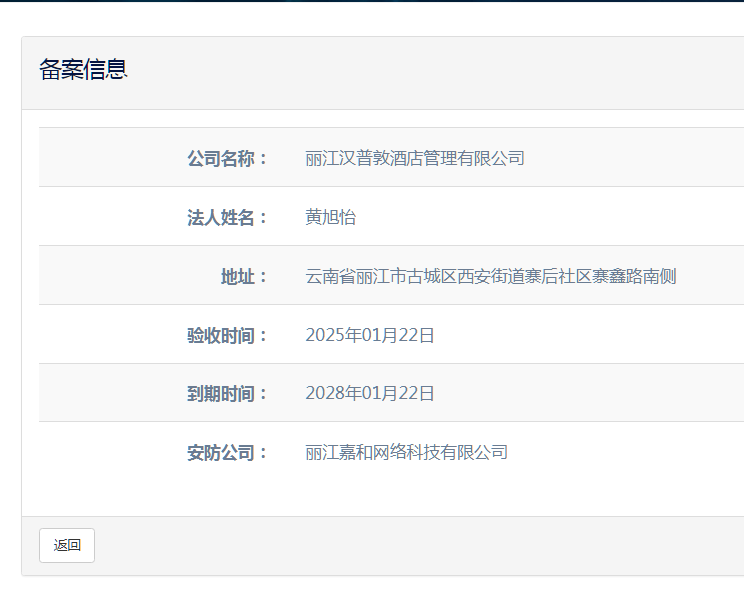 關于麗江漢普敦酒店管理有限公司電子監控安防合格證下證通知