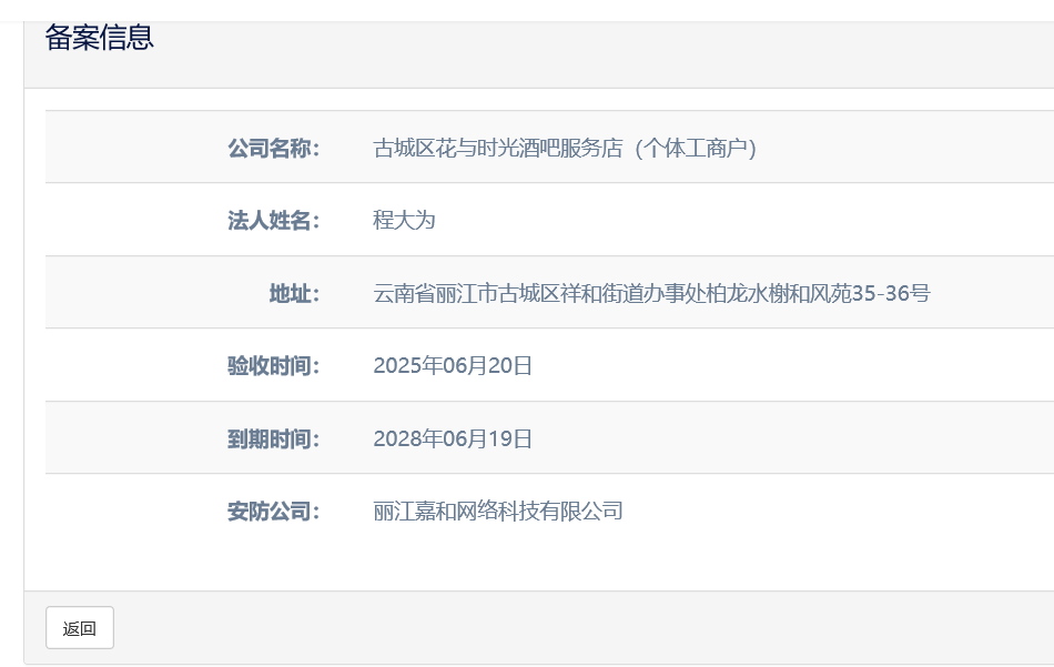 關于古城區花與時光酒吧服務店(個體工商戶)電子監控安防合格證下證通知