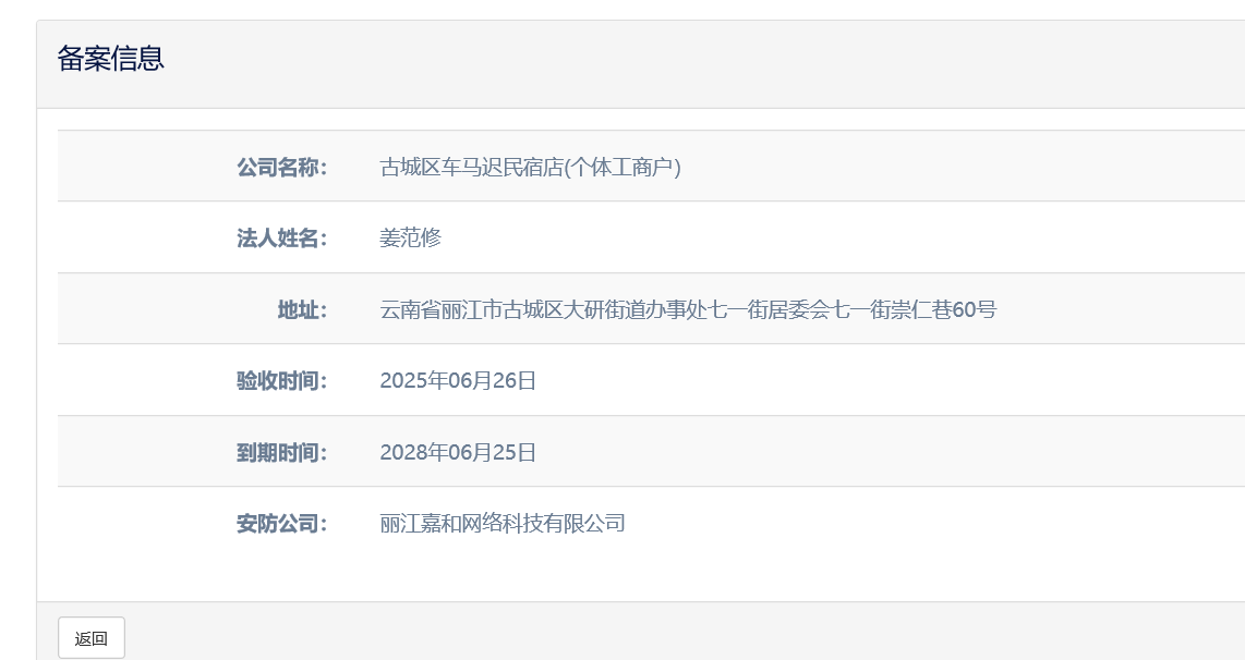 關于古城區車馬遲民宿店(個體工商戶)電子監控安防合格證下證通知