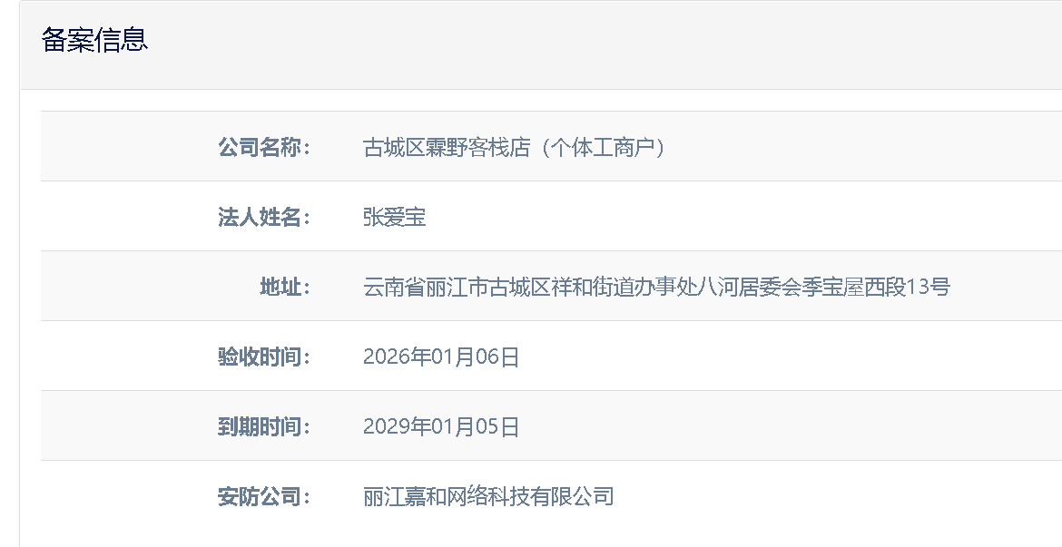 關于古城區霖野客棧店(個體工商戶)電子監控安防合格證下證通知