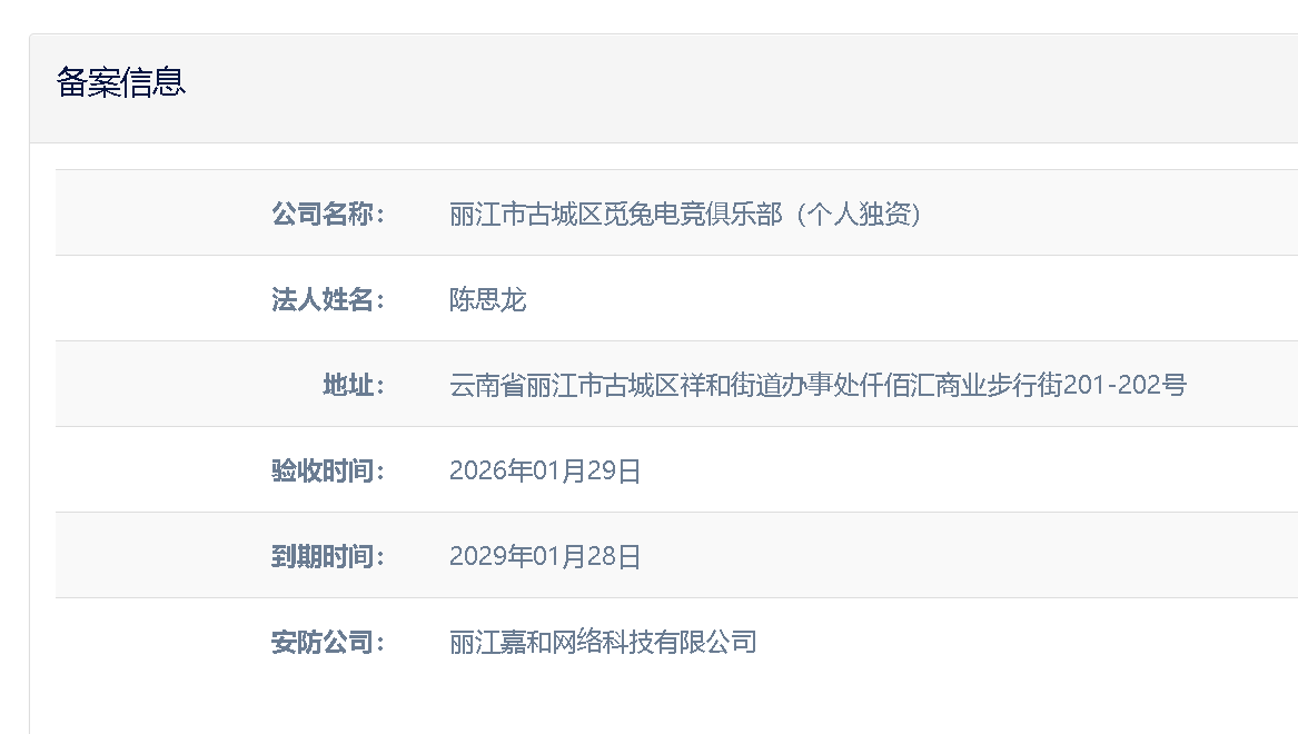 關于麗江市古城區覓兔電競俱樂部(個人獨資)電子監控安防合格證下證通知
